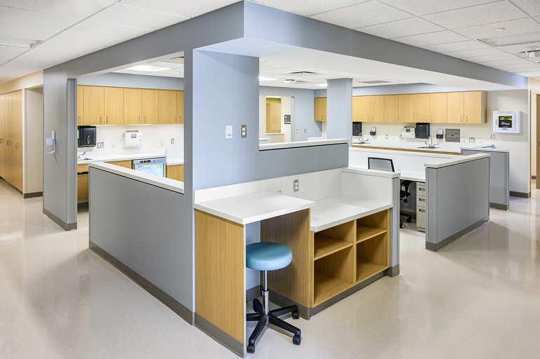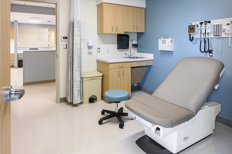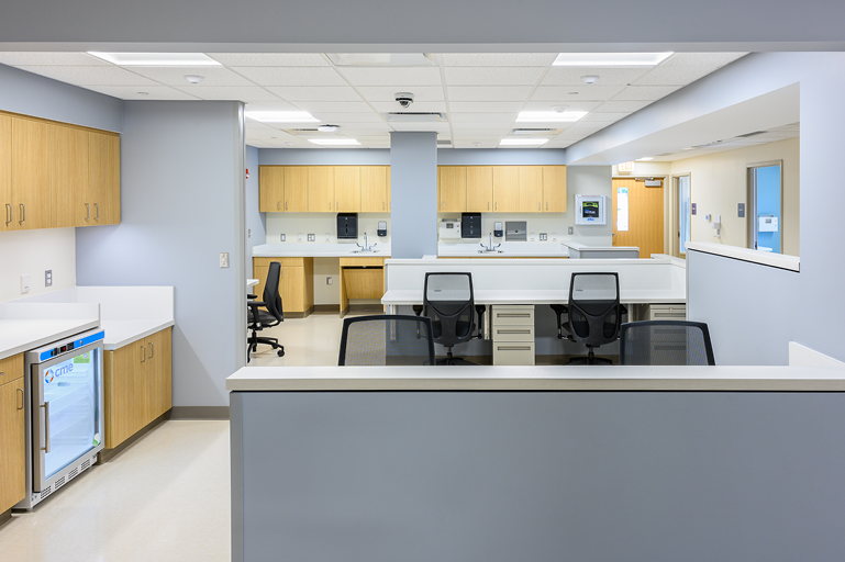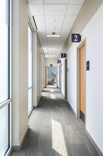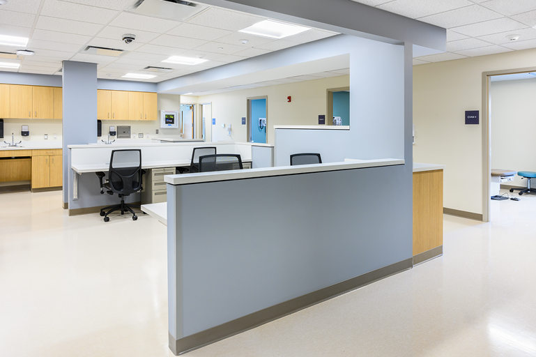 LWDA desgined this six exam room Urgent Care center for Emerson Health, to assist with its expansion of services to the surrounding communities. Located in a commercial shopping center suite, the design builds on previous Urgent Care centers designed by LWDA. The design organizes the suite for the delivery of fast and efficienct services to patients, by focusing on staff movements and patient privacy.